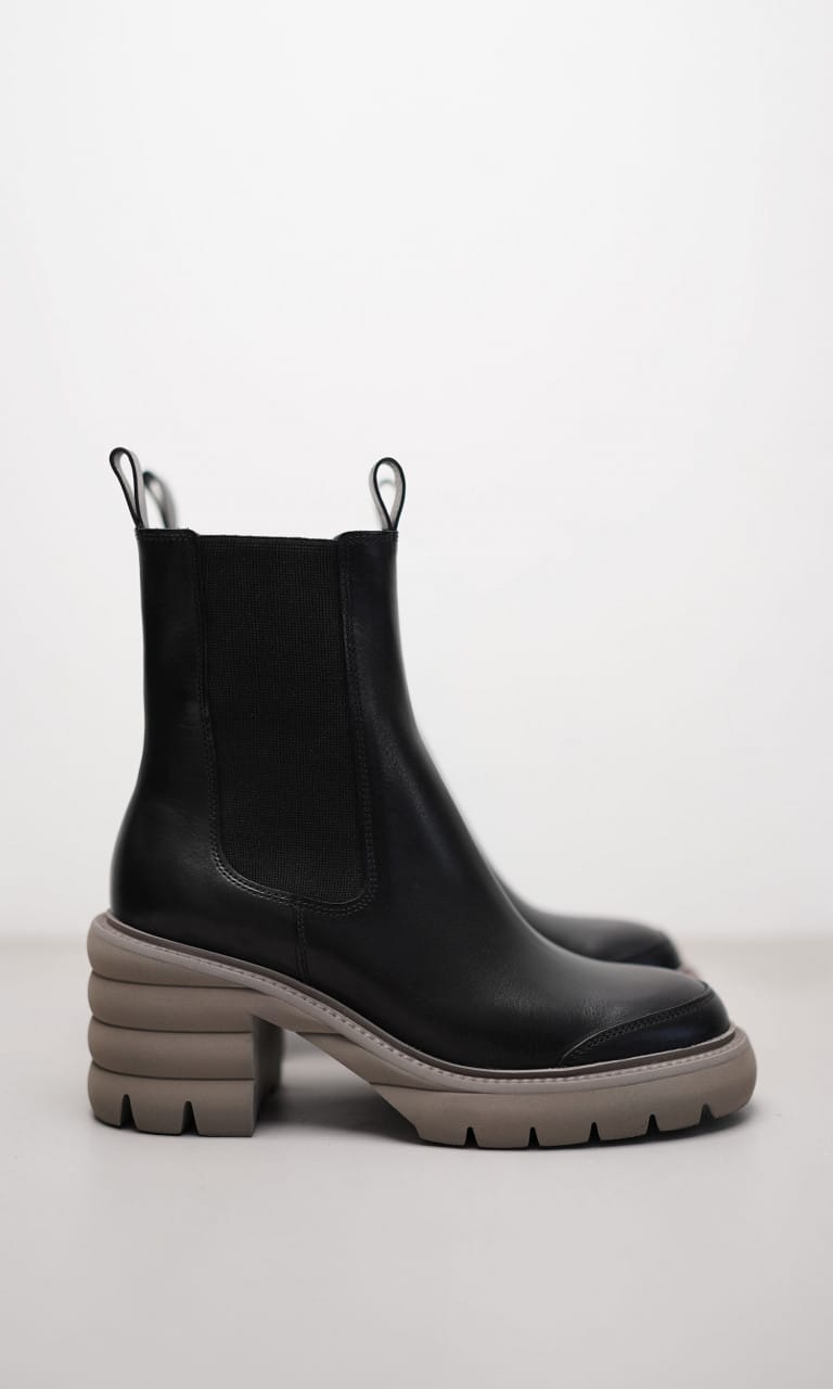 Le look contrasté de notre nouvelle bottine BUMP attire les regards de manière moderne. Ce modèle épuré associe l’aspect brut de la semelle profilée à un talon bloc féminin. Malgré le talon haut, notre modèle assure un port confortable. La semelle extérieure grise contraste de manière tendance avec le cuir de veau noir de la bottine. Associez notre modèle à des looks de bureau modernes.