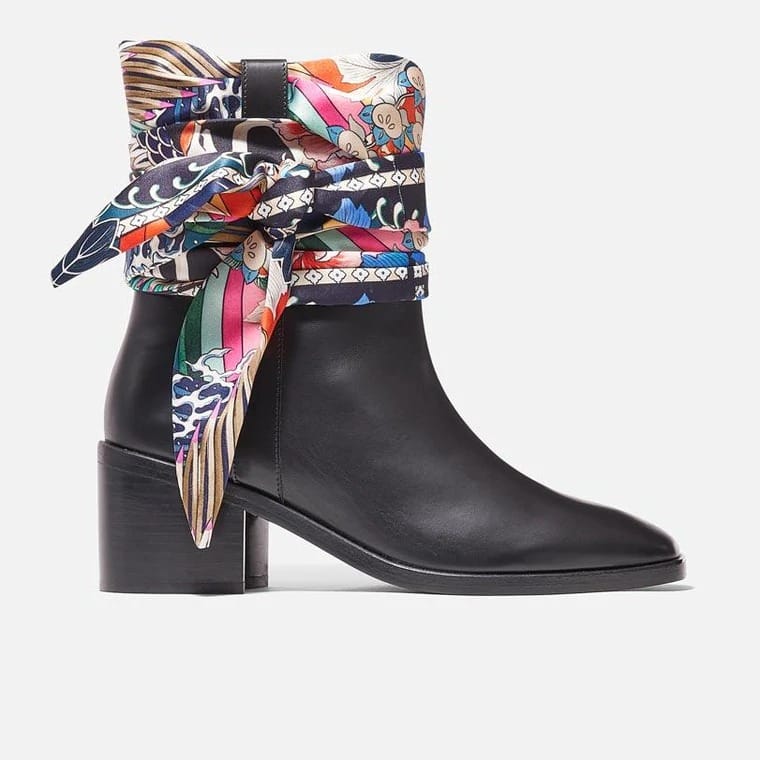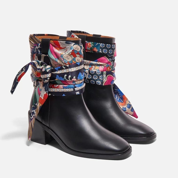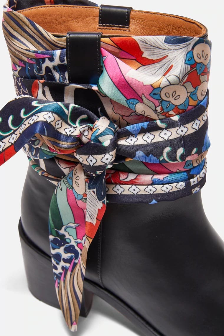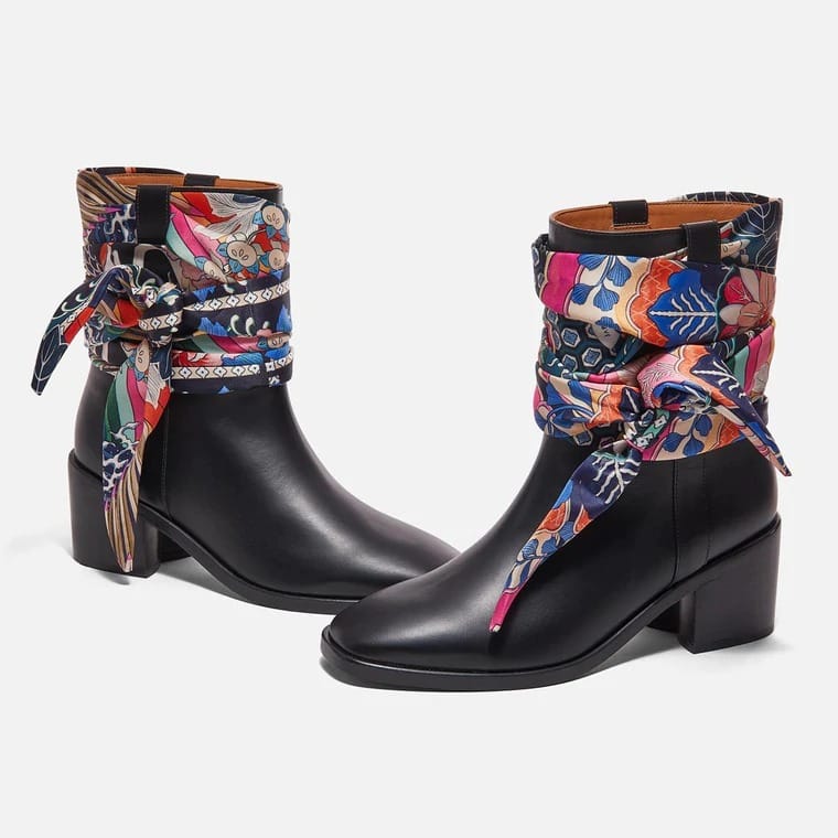 Bottines Clergerie by Chufy en veau poli noir avec foulard noué en satin imprimé Japon