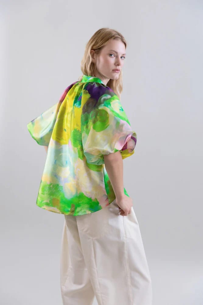 Confectionnée en polyester recyclé , cette blouse se distingue par sa légèreté et son fini chatoyant. Son imprimé Bloomlight unique , mêlant verts, jaunes et détails artistiques, apporte une touche de fraîcheur et d’éclat, faisant de cette pièce polyvalente un choix idéal pour des tenues décontractées comme habillées.