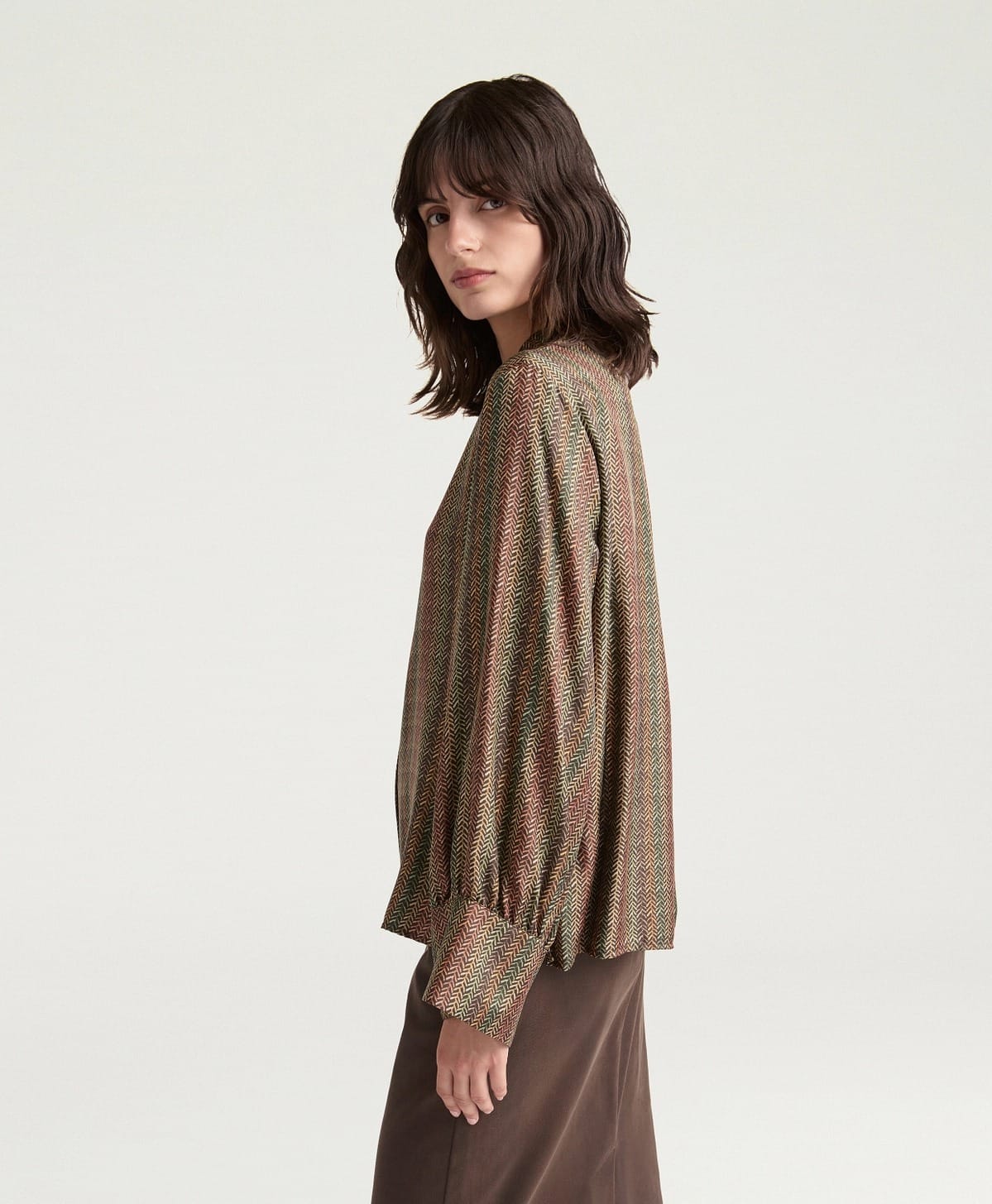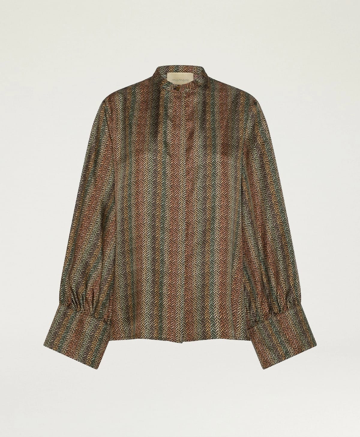 Chemisier légèrement surdimensionné en sergé de pure soie imprimé, avec col mandarin et patte de boutonnage dissimulée. Fentes latérales et manche précieuse avec poignet à boucle froncée.