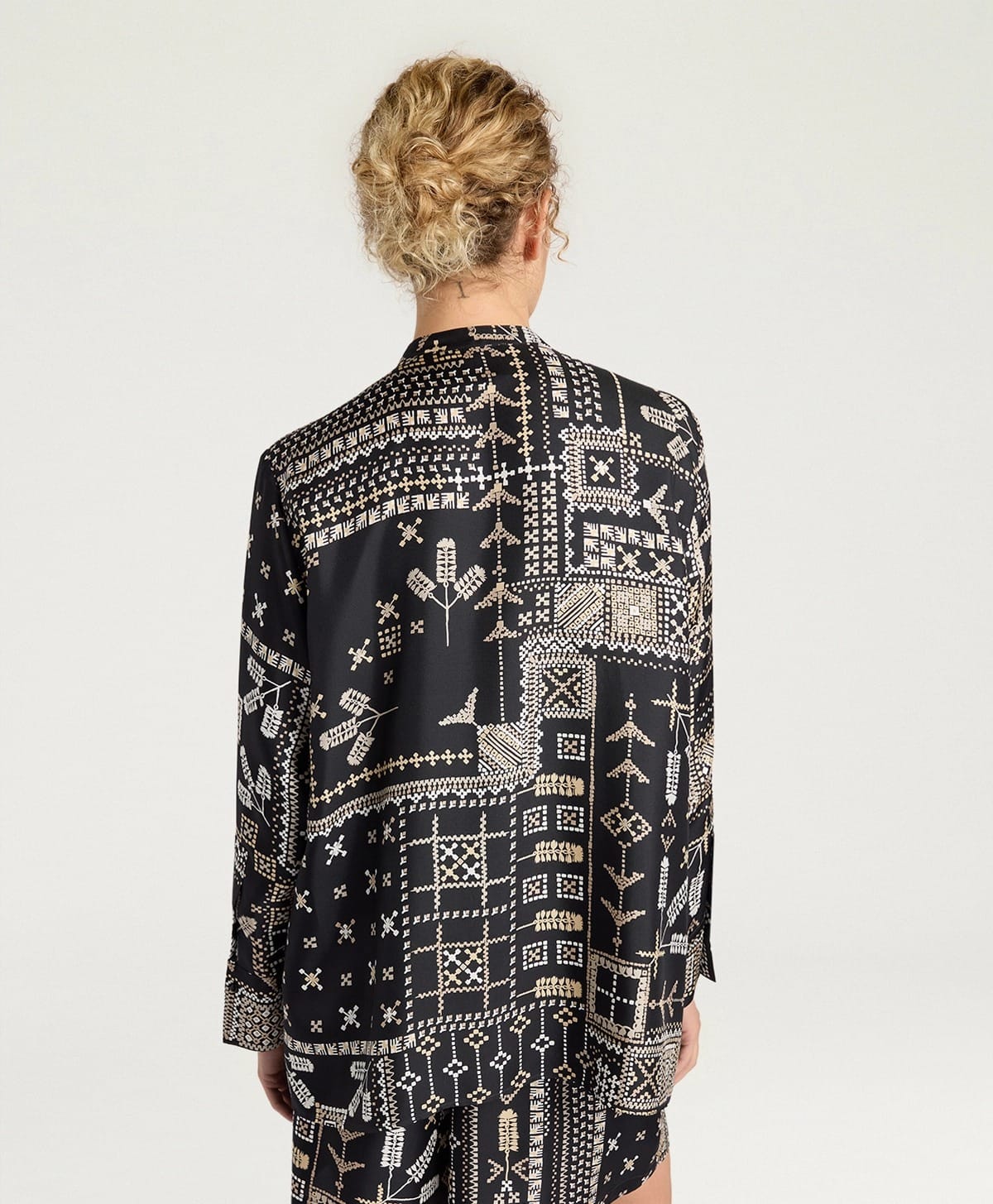 Chemisier large en sergé de soie imprimé en Italie. Col mandarin, boutonnage et détail de renfort d’épaule sur le devant. Fentes latérales, manches longues terminées par un poignethomme, deux petits plis et un bouton en nacre.