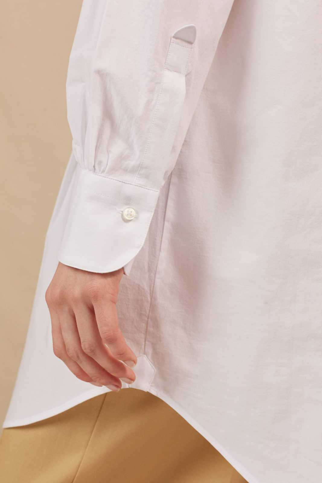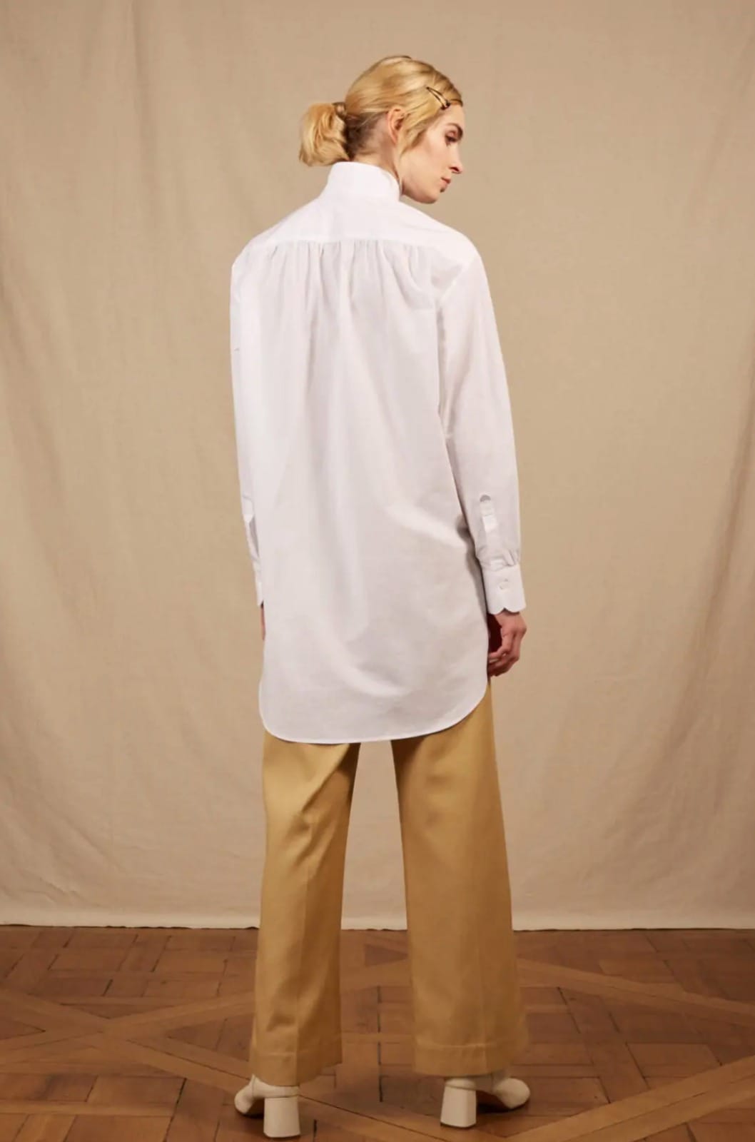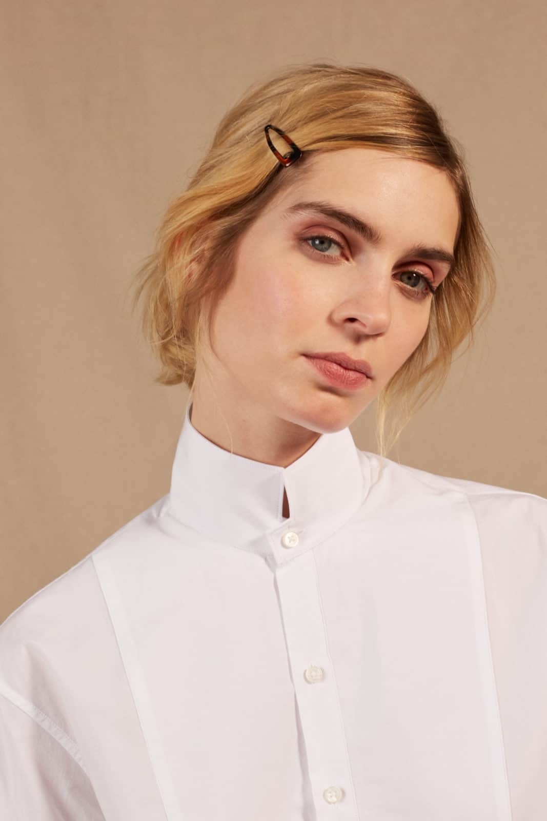 MUSE allie héritage et modernité pour vous procurer un style élégant inspiré par les modèles masculins d’époque. Le col officier haut de cette chemise sublime le port de tête, et met en valeur votre visage. Le plastron carré intègre un pli rond sur le pan avant de la chemise et la gorge de boutonnage dont la longueur est alignée sur celle du plastron, pour un enfilage par le haut. La coupe Bourrienne longue de cette pièce orne le dos de fronces et apporte un volume plus large au niveau du corps. Coupée dans un mélange de coton-lin tissé en Italie, MUSE est une pièce signature de la marque, à porter en ville avec un pantalon ou au bord de l’eau avec un maillot.