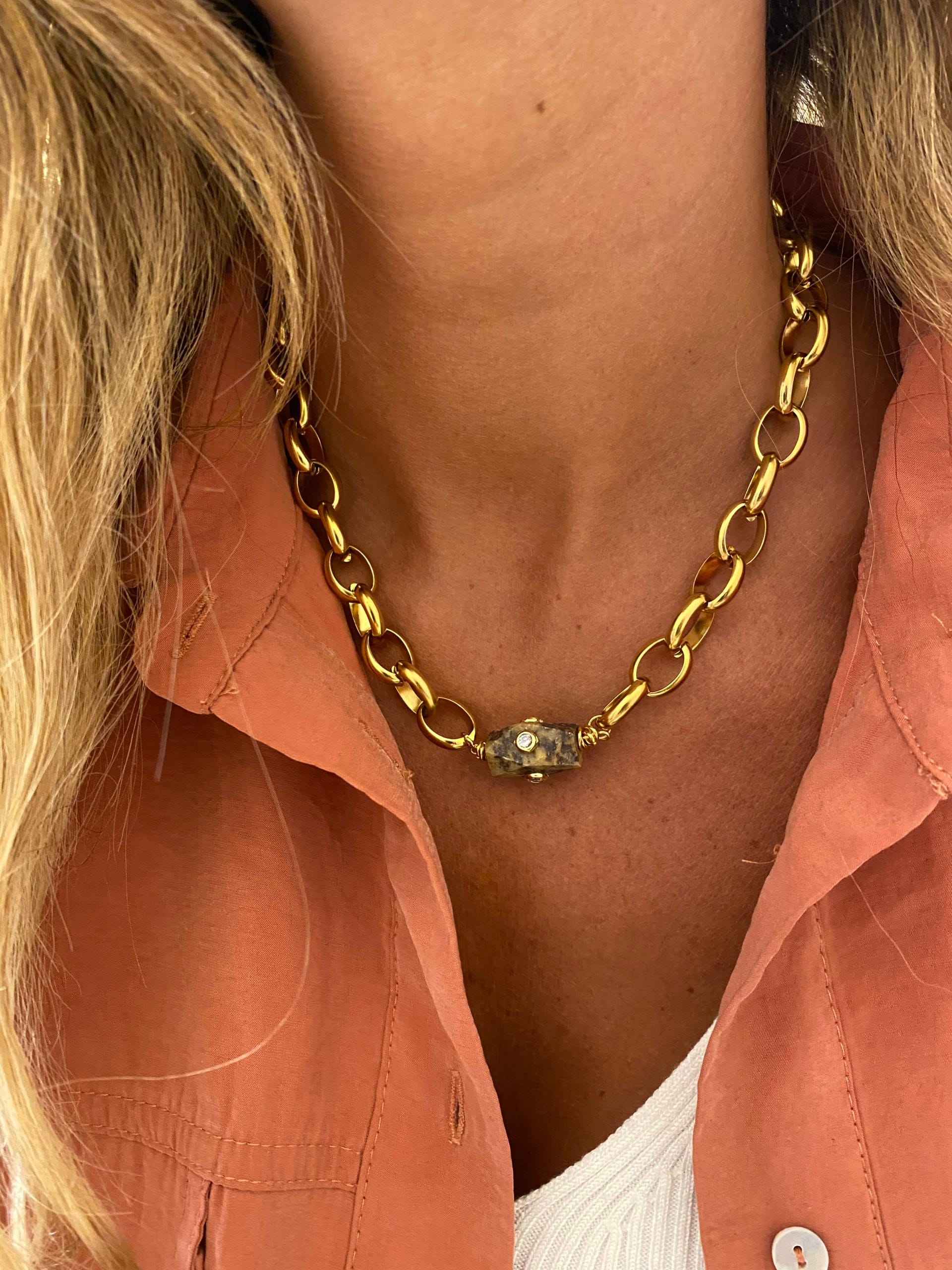 Collier chaine maille ronde 1 cm or et pierre naturelle avec zirconium.