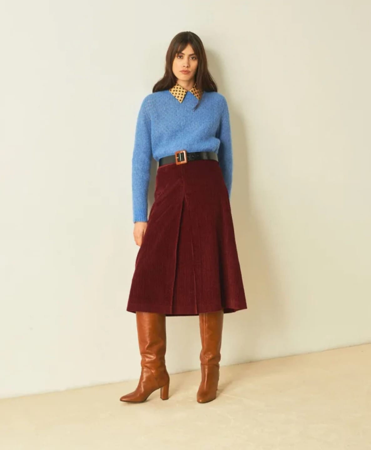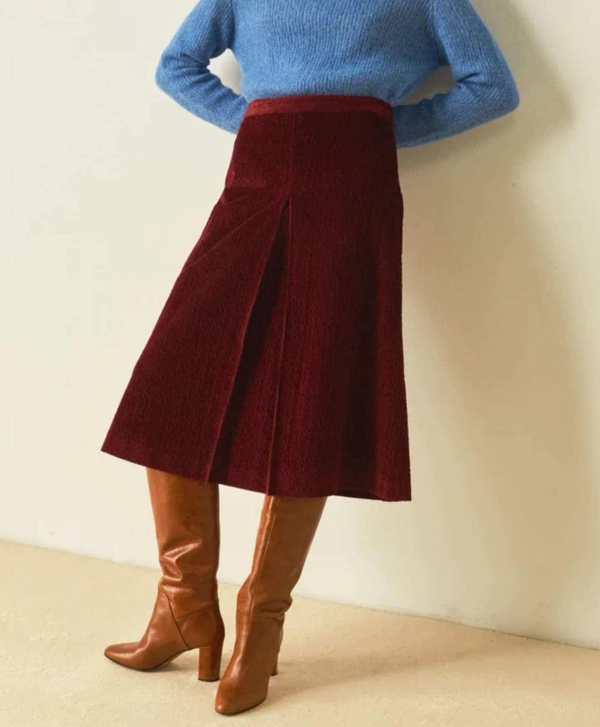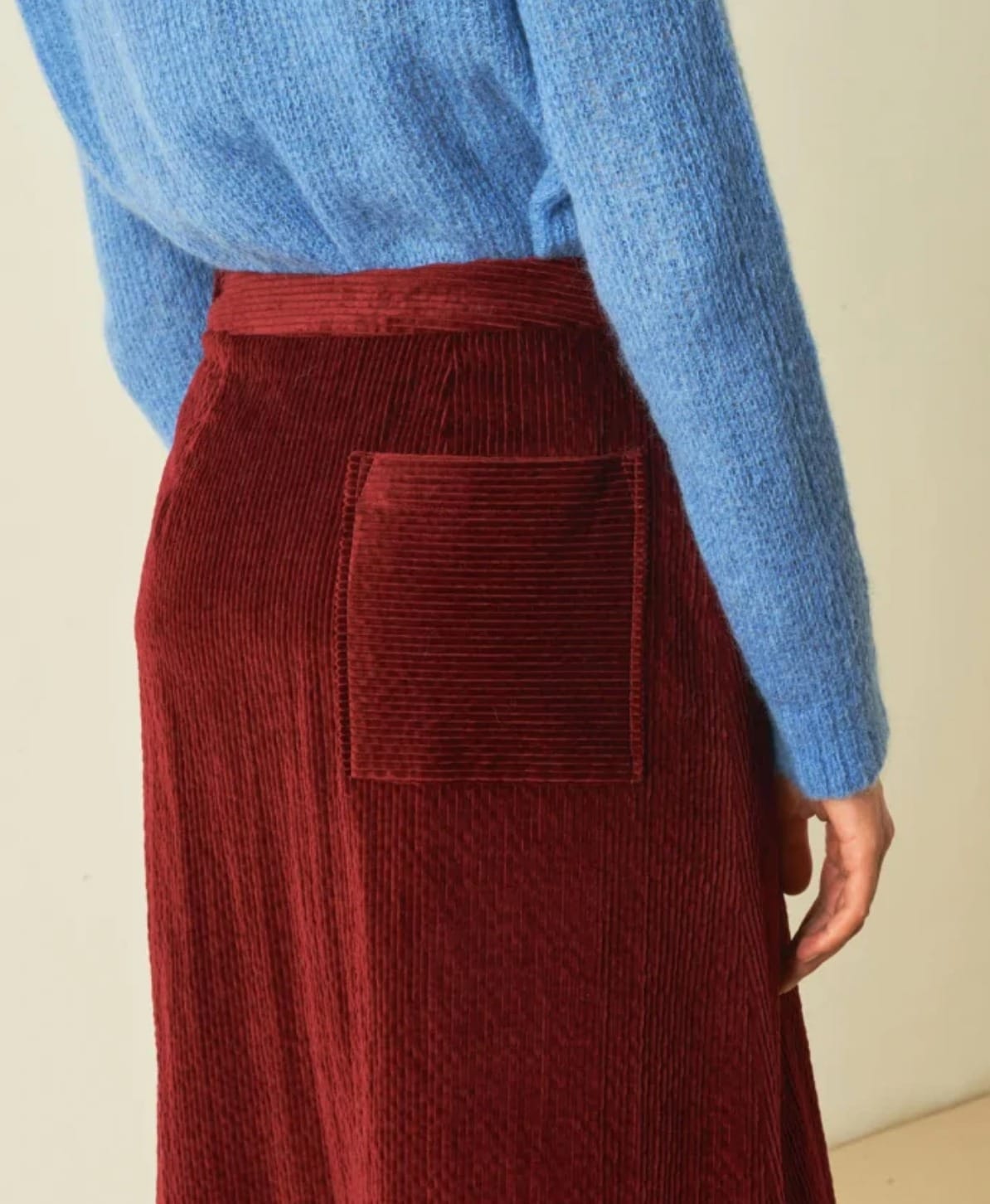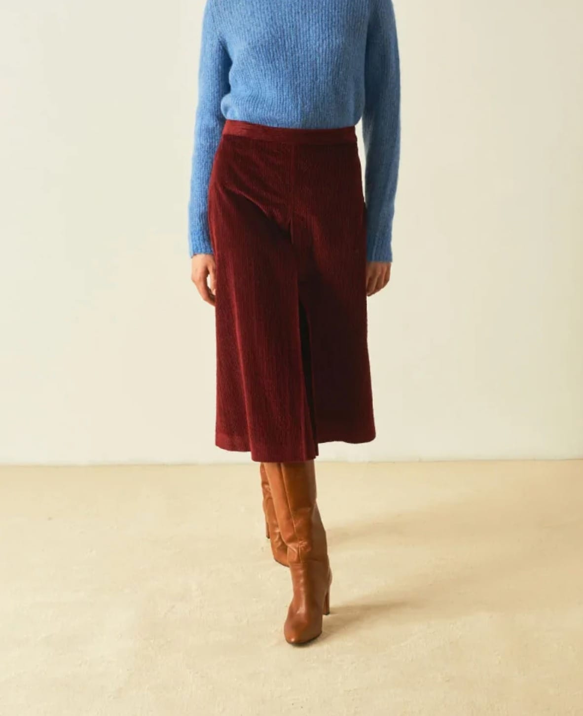 Jupe midi en velours côtelé stretch Taille légèrement relevée, poche plaqué au dos, ouverture par fermeture éclair sur la hanche. La ligne de Miramas est évasée, avec un fond plissé sur le devant, parfaite pour être portée avec des bottes hautes ou des sneakers.
