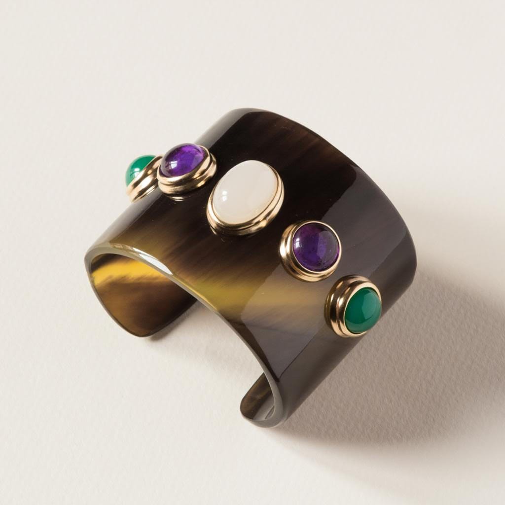 Modèle iconique, cette manchette en sabot au design pur et graphique, est ornée d’une labradorite, de deux améthystes et de deux agates vertes. Gaïa comme la déesse de la terre, symbole de puissance et d’harmonie.