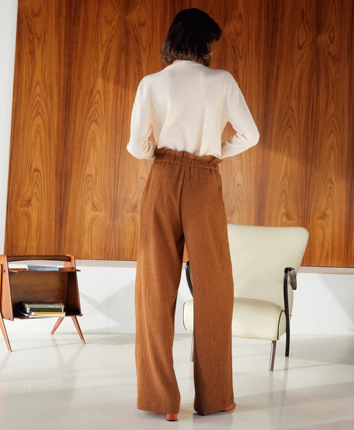 Pantalon long en laine seersucker stretch. Taille haute élastiquée avec boucle de poche, pinces pour cacher les poches françaises arrondies, ouverture avec bouton et zip. Coupe confortable et look tendance.