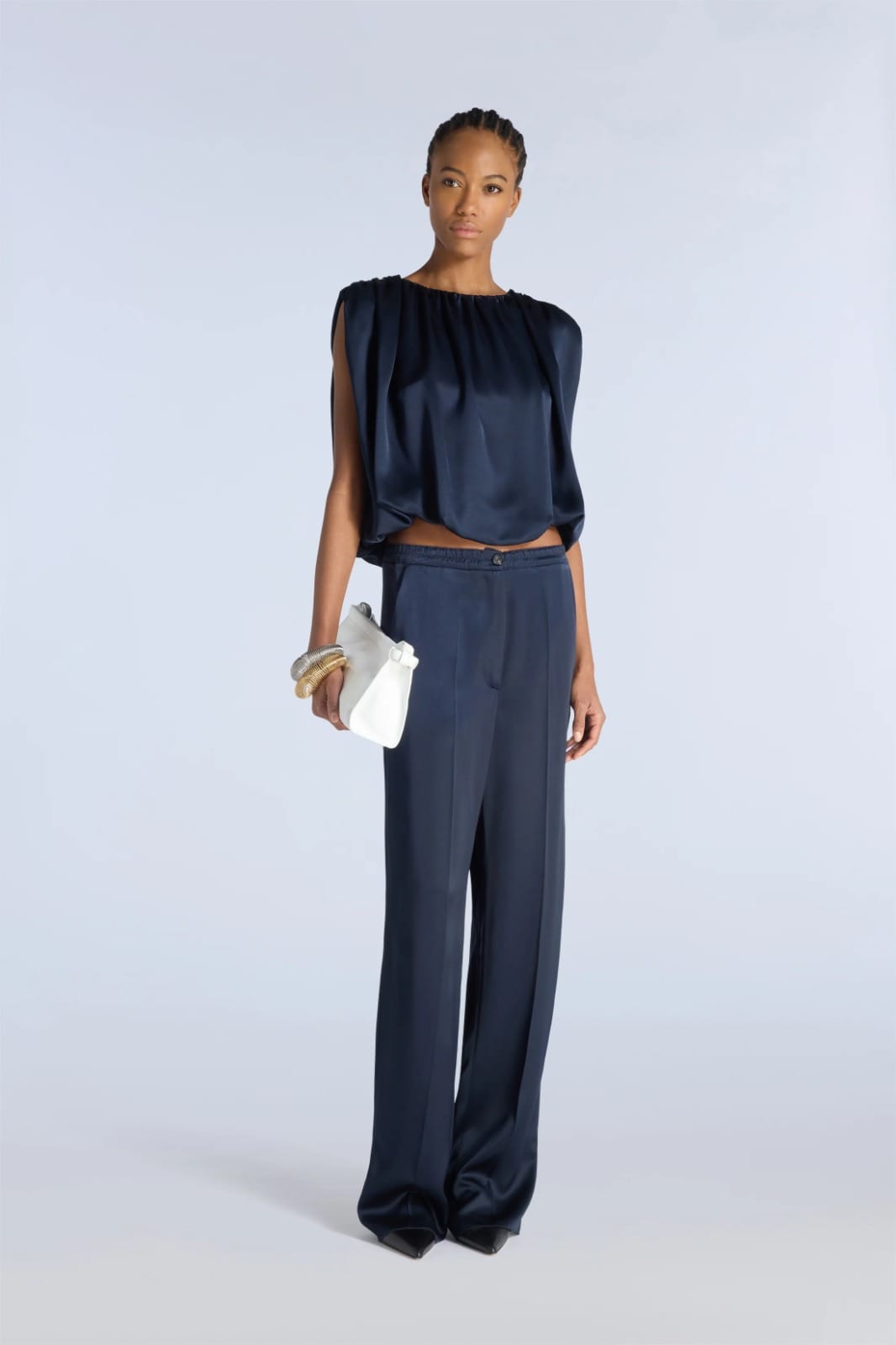 PANTALON PALAZZO EN LIQUID SATIN AVEC ÉLASTIQUE À LA TAILLE. FERMETURE CENTRALE AVEC BOUTON ET ZIP CACHÉ. POCHES LATÉRALES CACHÉES, PLIS REPASSÉS À L’AVANT ET À L’ARRIÈRE.