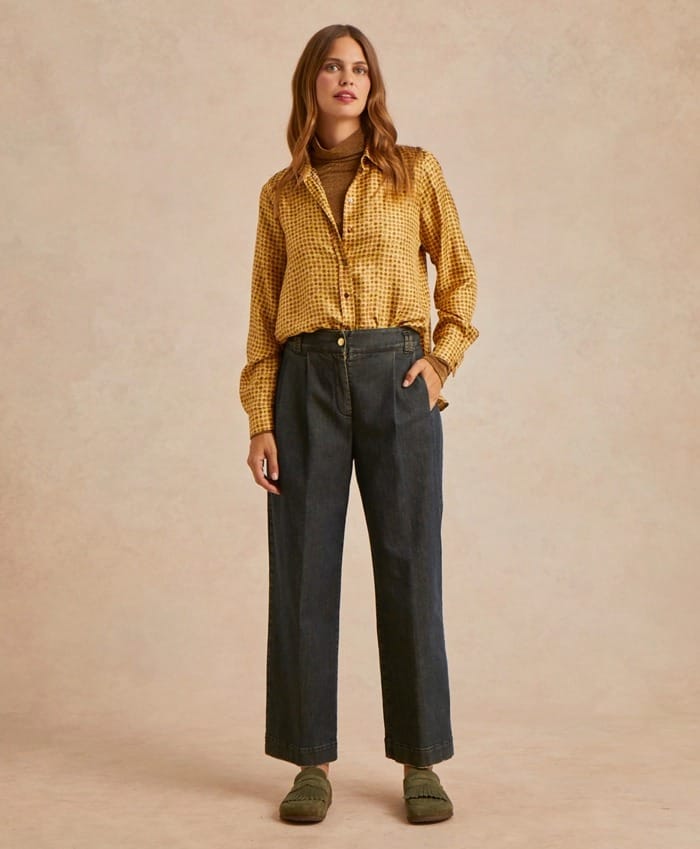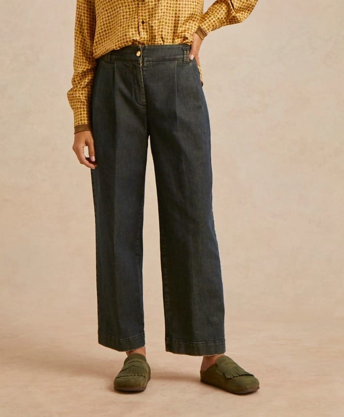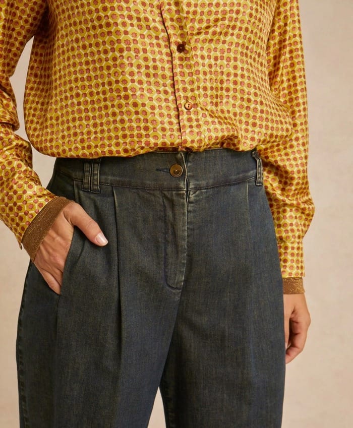 Pantalon style haute couture en denim de coton avec lavage « stone washed ». Taille normale, entrejambe descendu, doubles pinces, poches avant sur le côté et au dos avec double passepoil. La coupe est large avec jambe droite. Ouverture avec bouton à clou et fermeture éclair.
