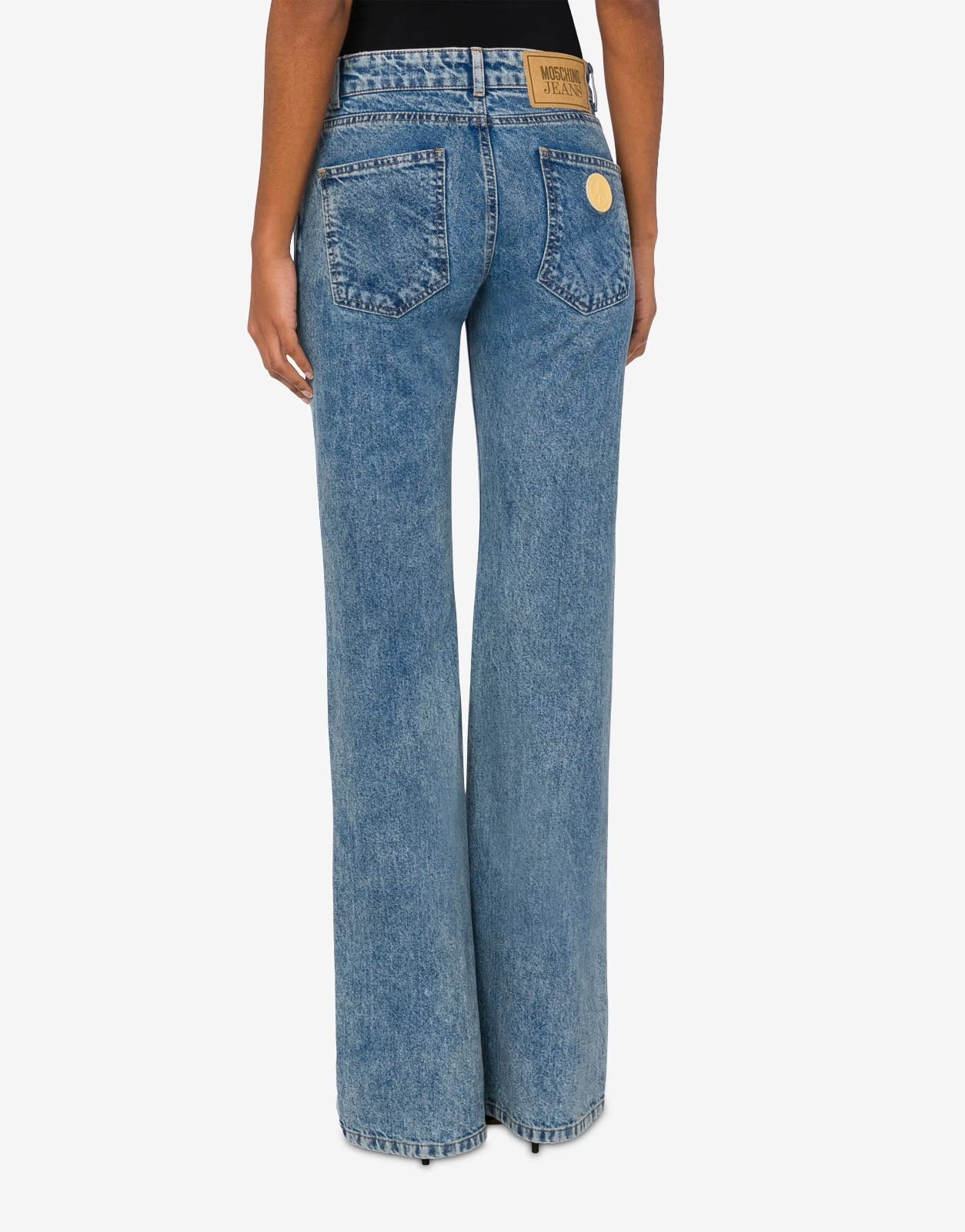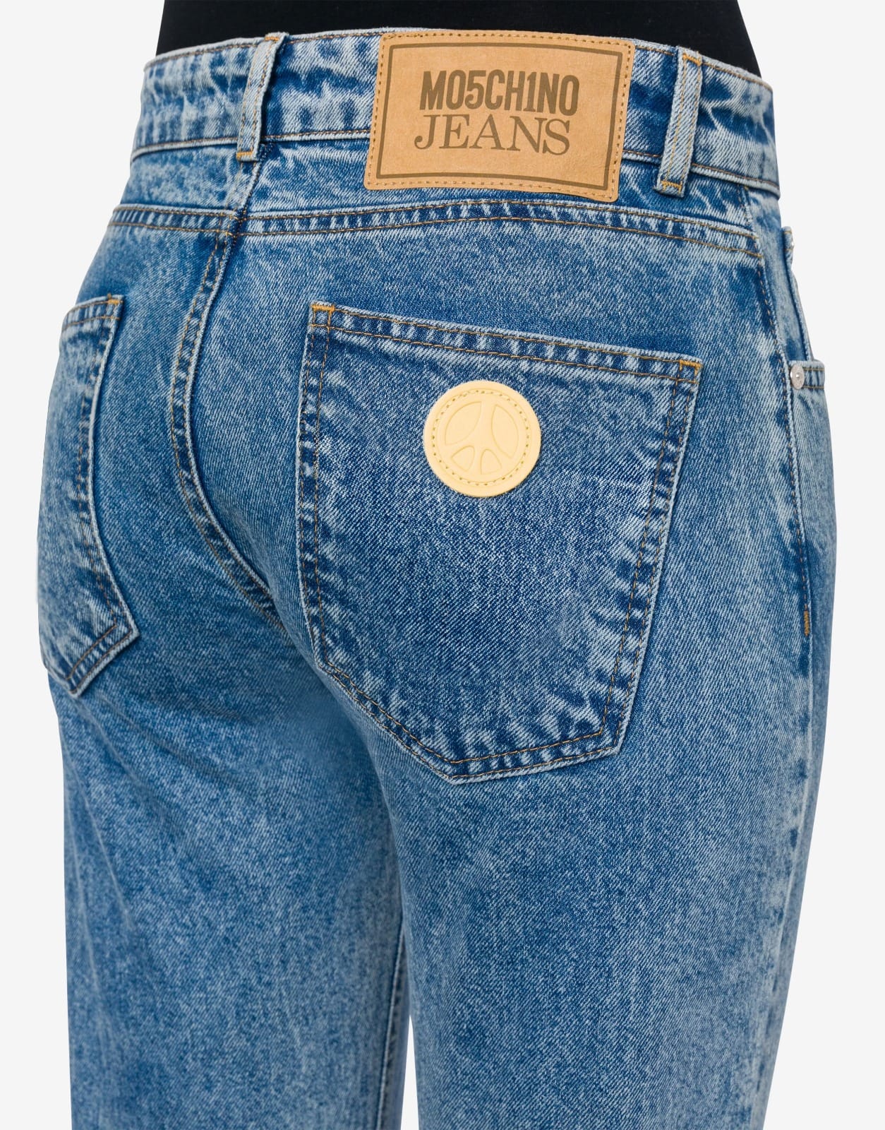 Pantalon patte d’éph et cinq poches en denim de coton agrémenté d’un écusson symbole de la paix au dos.