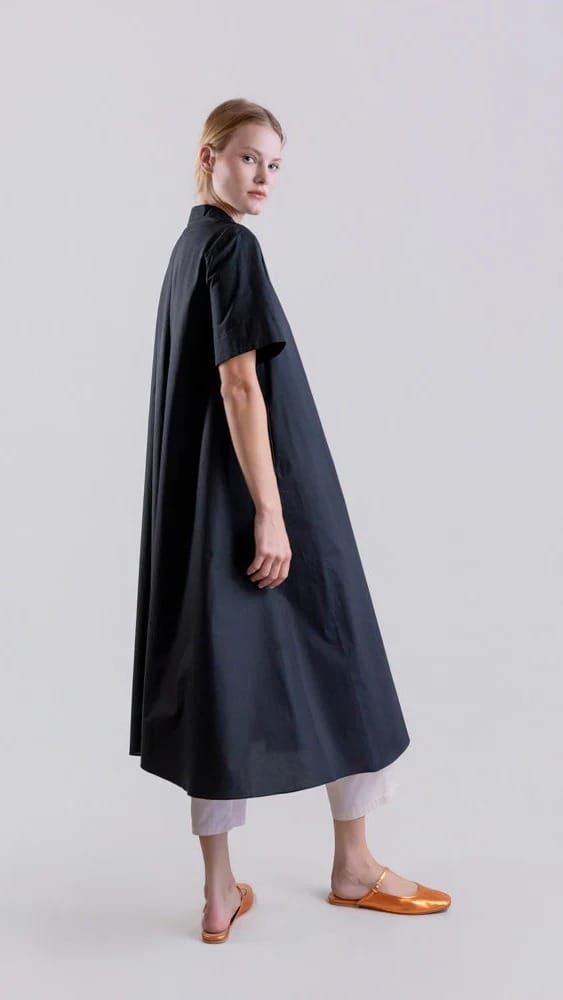 Les manches courtes, qui s’arrêtent juste au-dessus du coude, équilibrent la silhouette, tandis que l’ourlet légèrement évasé apporte mouvement et légèreté. La taille légèrement cintrée met en valeur la silhouette sans compromettre le confort.
