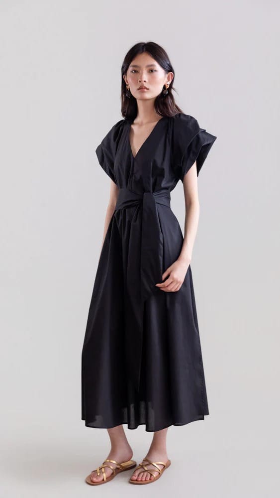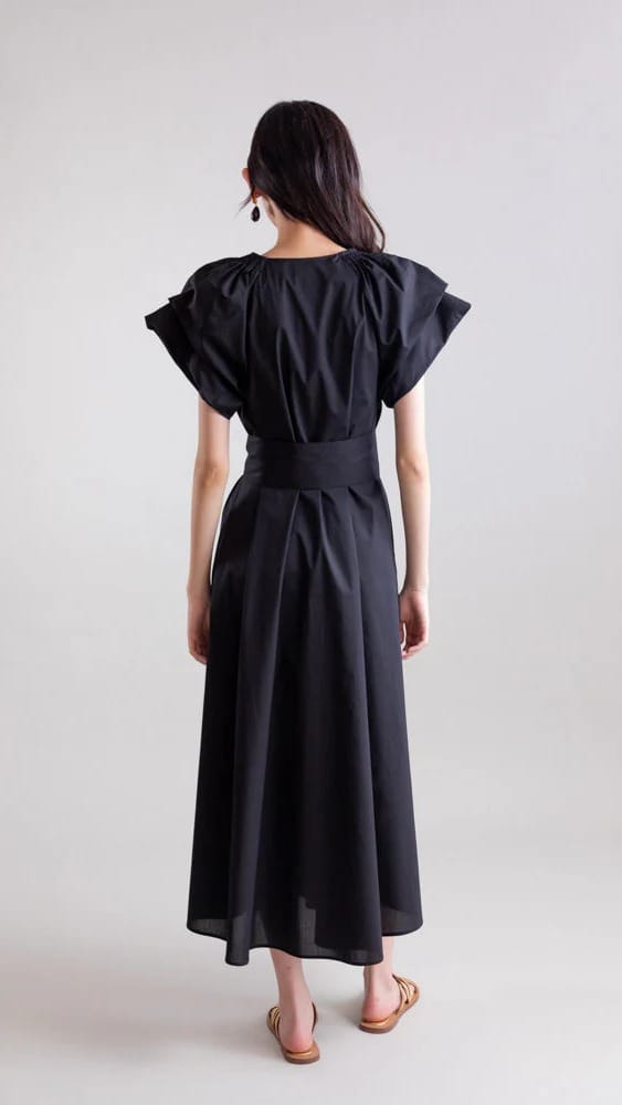 Cette longue robe en popeline allie l’élégance classique à une touche de modernité et de fluidité. Son décolleté en V profond souligne la féminité, tandis que les manches bouffantes aux épaules créent un volume délicat et sophistiqué.
