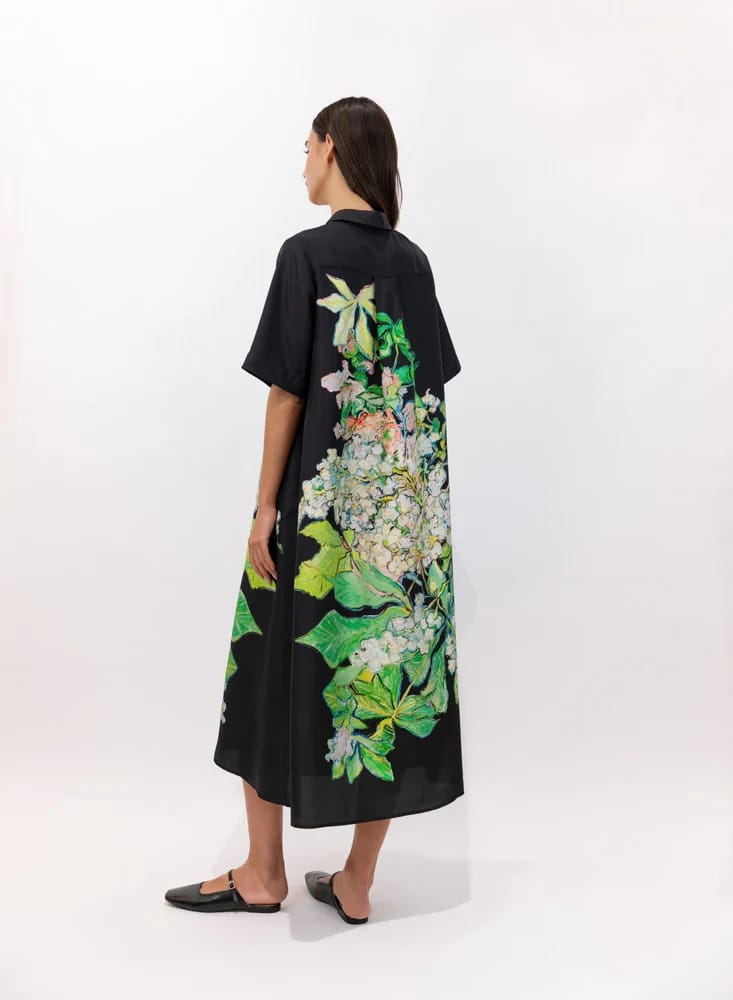 Cette longue robe, inspirée d’une chemise, allie structure et fluidité dans une silhouette sculpturale qui descend jusqu’à la cheville. Confectionnée en soie habotai , elle offre légèreté, fraîcheur et un drapé naturel, assurant confort et définition. Ses manches courtes et son col chemise fermé évoquent la tradition du tailleur, tandis que ses lignes épurées et légèrement volumineuses créent un effet contemporain et élégant.