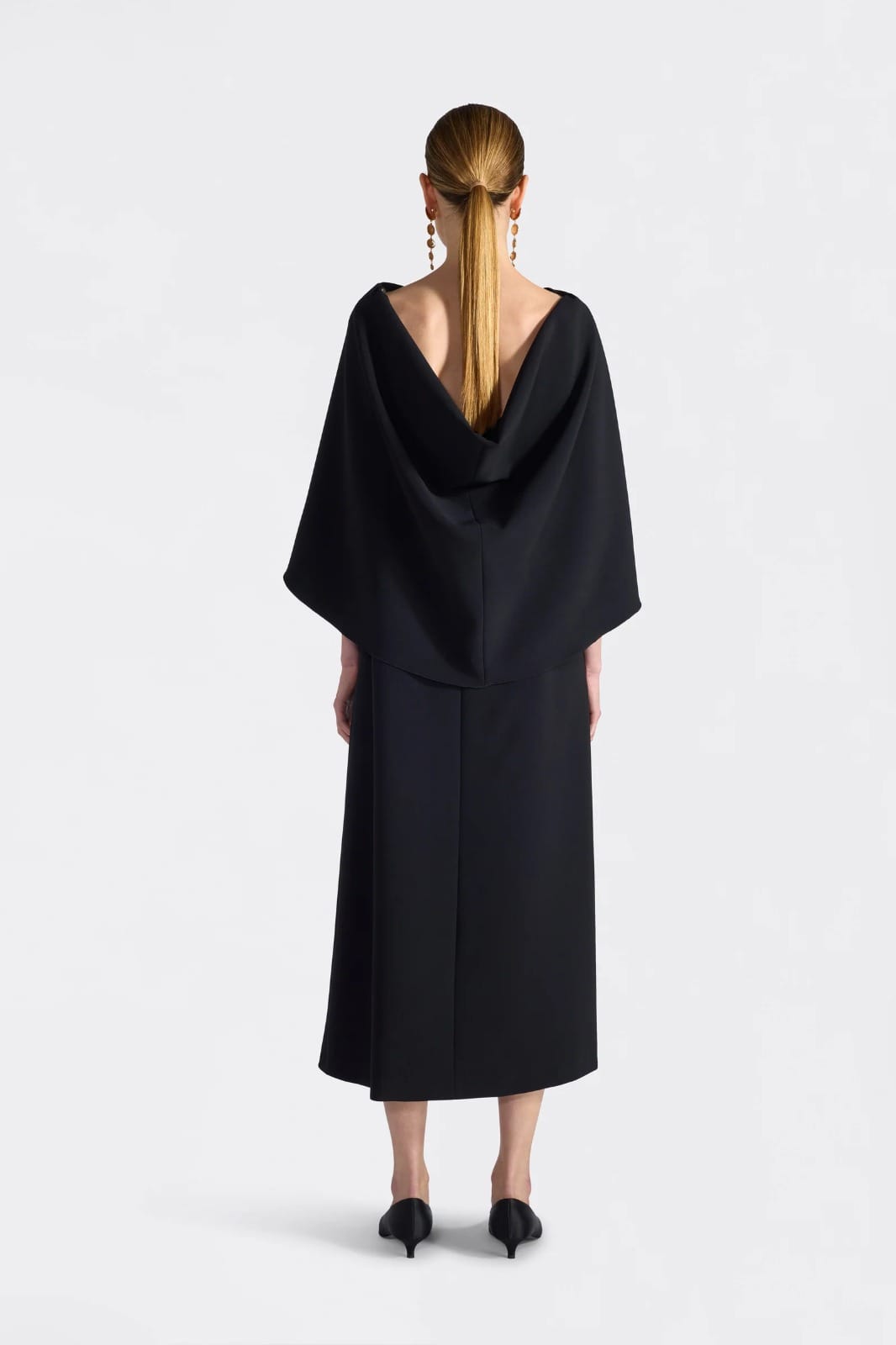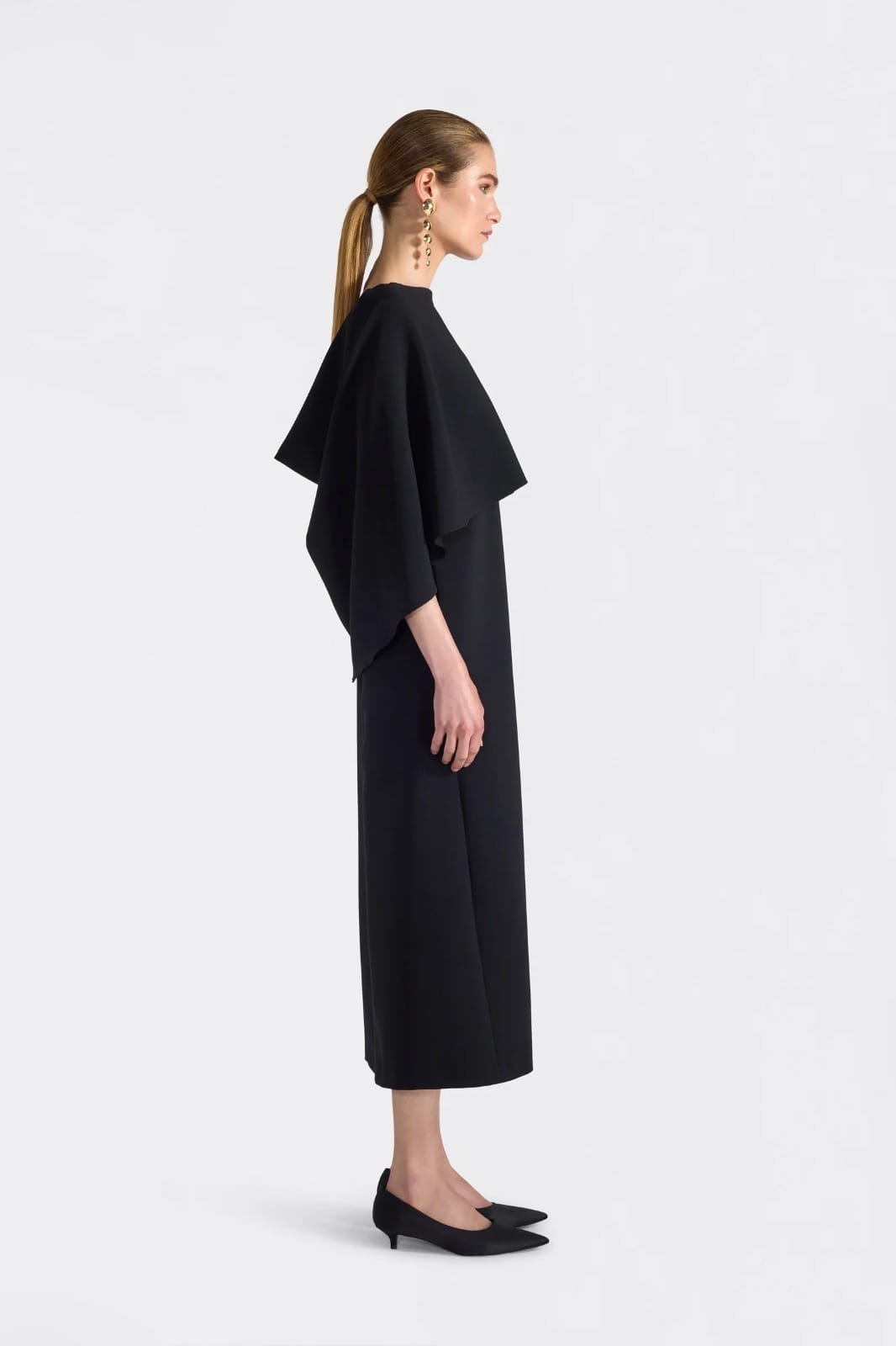 ROBE MIDI EN CADI, ENCOLURE BARQUETTE, INSERT MANTEAU À L’AVANT ET À L’ARRIÈRE QUI CRÉE UN DRAPAGE ET COUVRE LES BRAS JUSQU’AUX POIGNETS.