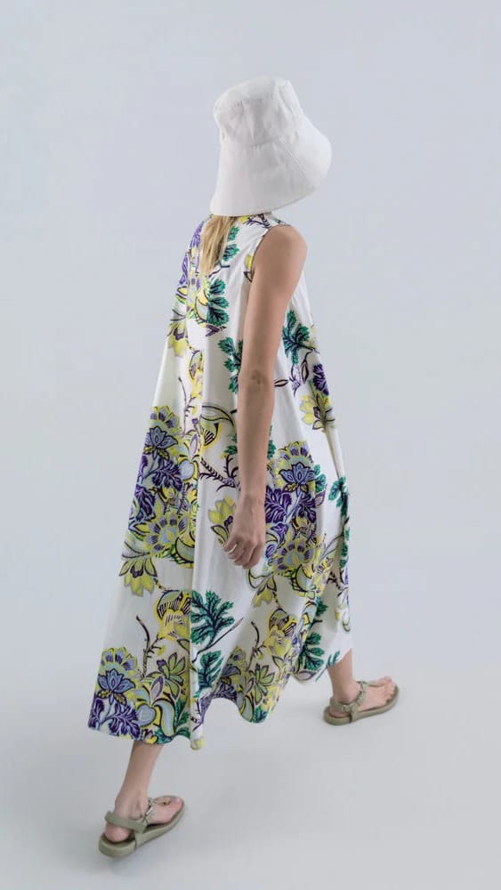 Le modèle intègre des poches discrètes , qui ajoutent de la fonctionnalité sans sacrifier la fluidité, et le drapé du tissu met en valeur l’ esprit bohème et artisanal de l’imprimé , avec de grandes fleurs inspirées des années soixante-dix qui ajoutent du caractère, de la fraîcheur visuelle et une touche graphique sophistiquée.