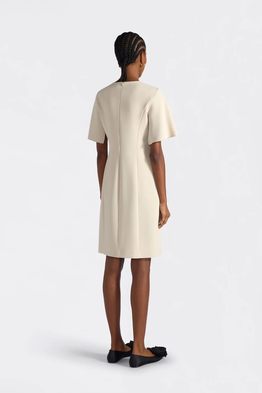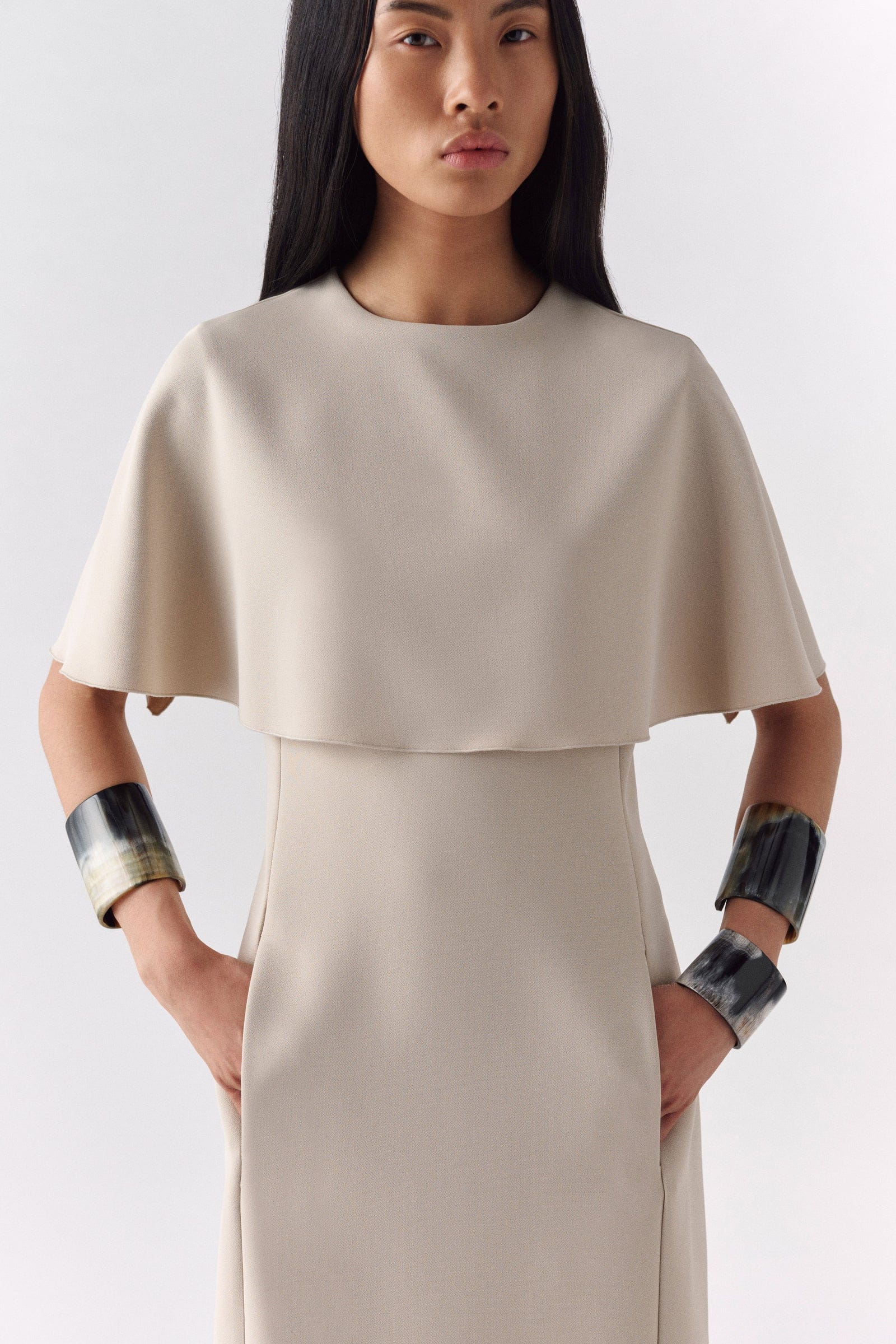 ROBE SHEETON SANS MANCHES EN CADI, ENCOLURE BARQUETTE, INSERT MANTEAU SUR LE DEVANT. FERMETURE CENTRALE À L’ARRIÈRE AVEC ZIP, POCHES LATÉRALES CACHÉES, LONGUEUR AU-DESSUS DU GENOU.