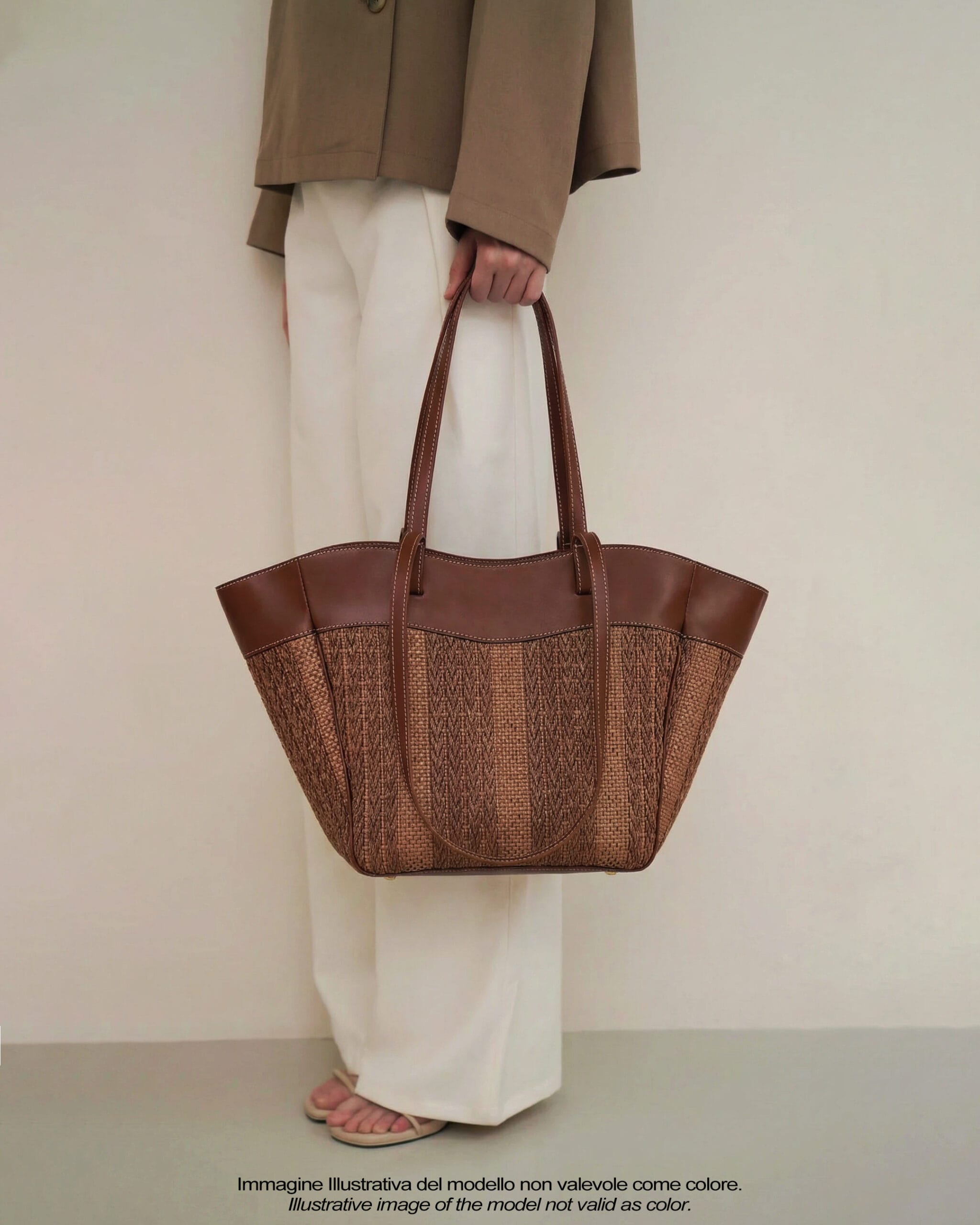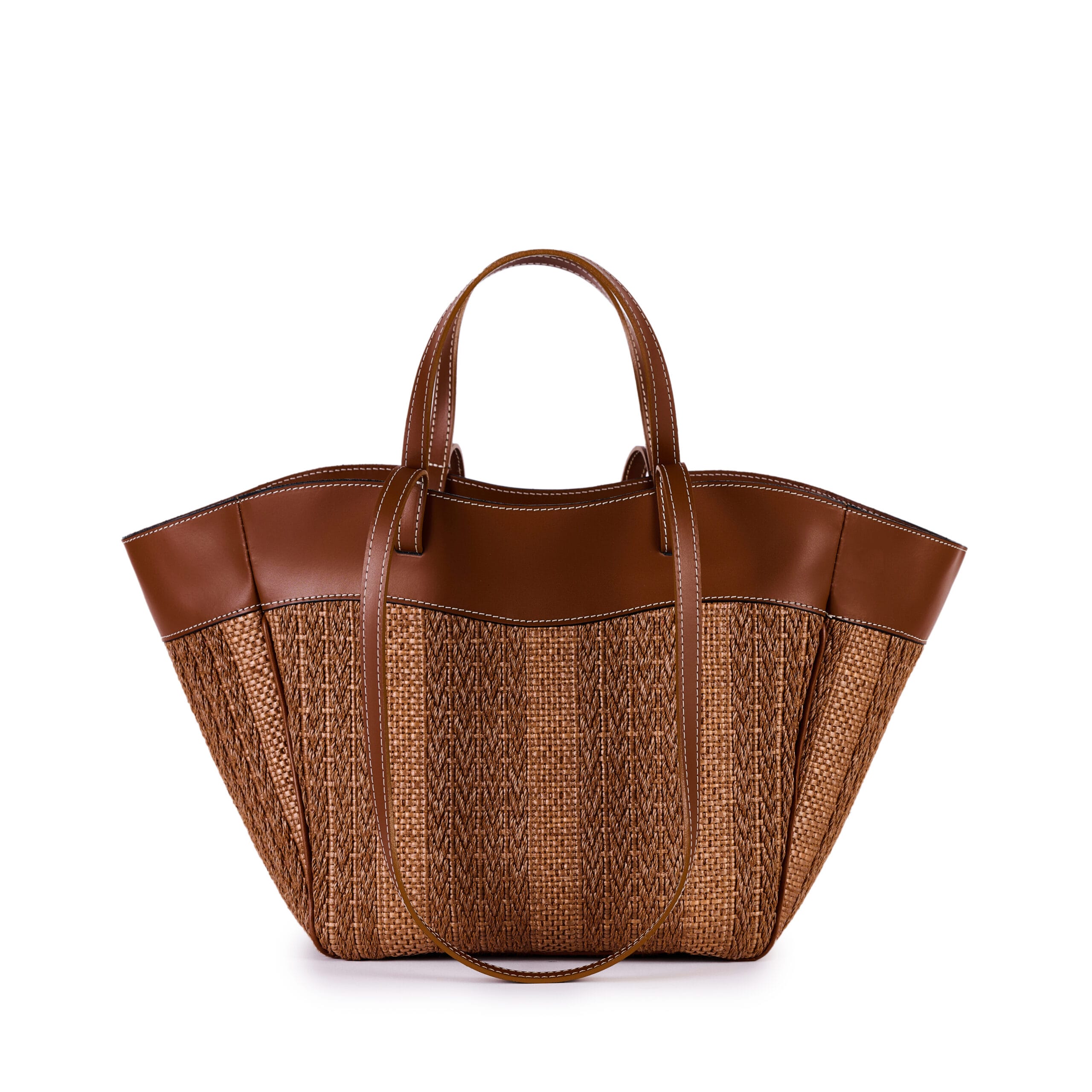 Sac en raphia jacquard avec détails en cuir, double poignée et bandoulière, fermeture zippée sur le dessus.