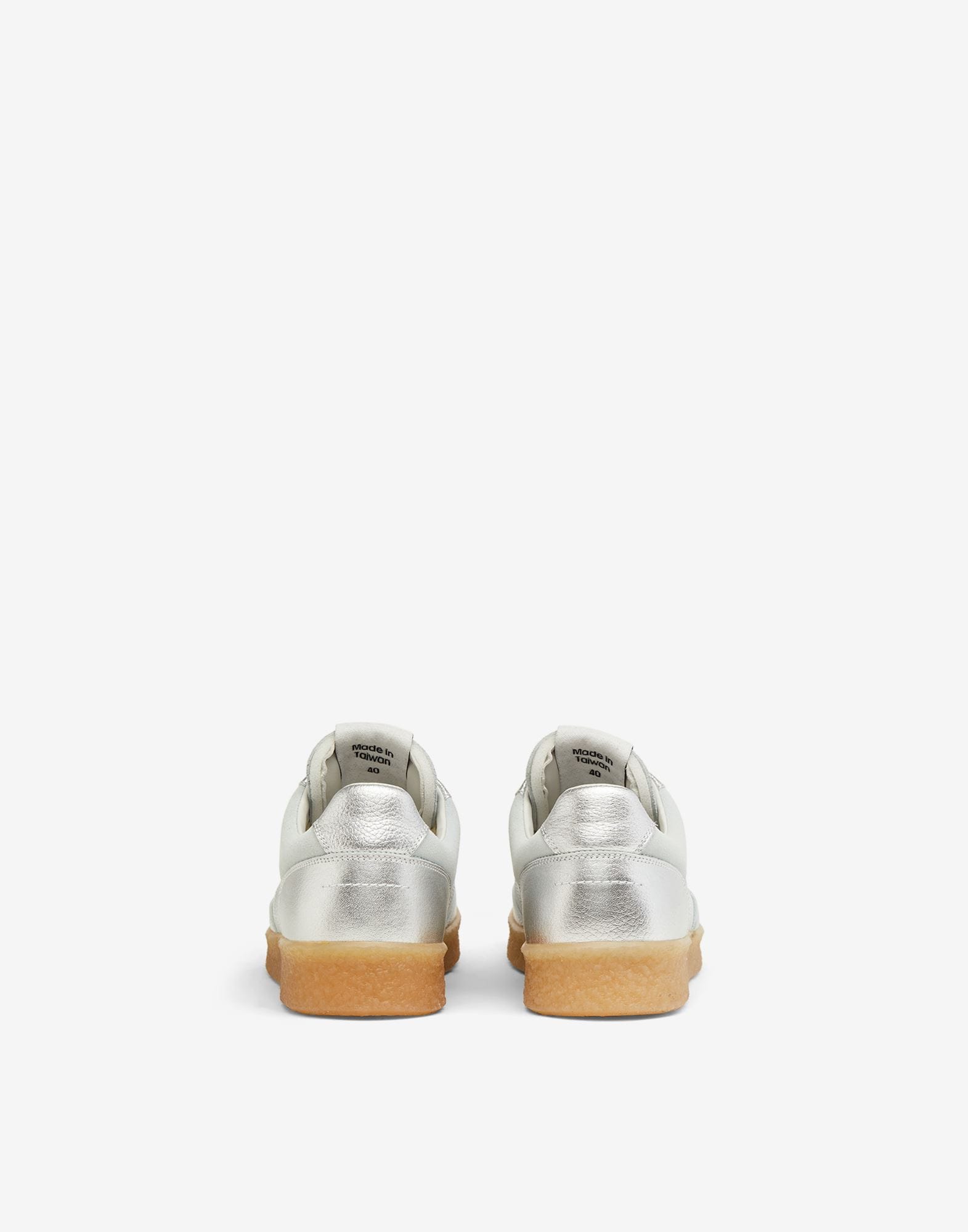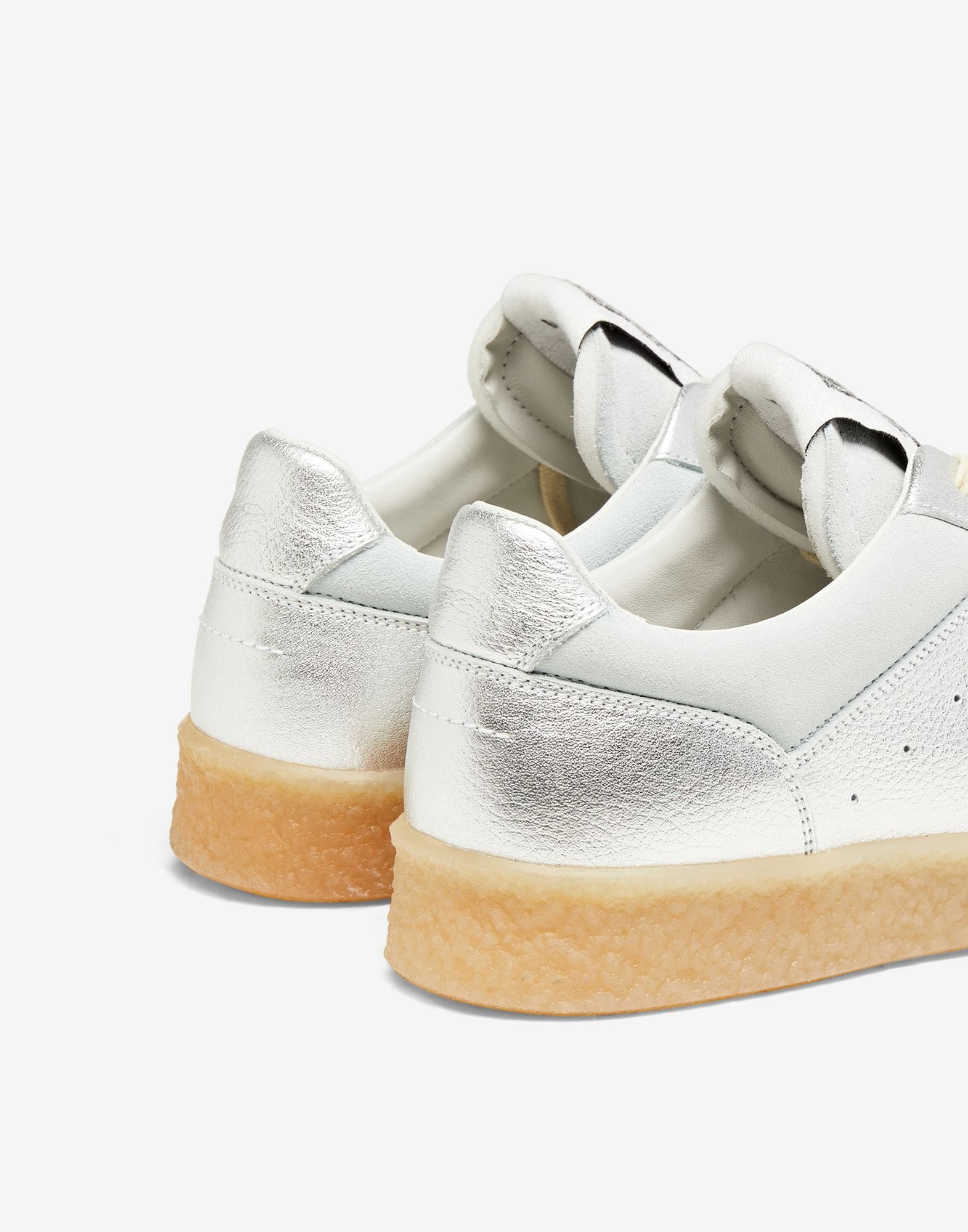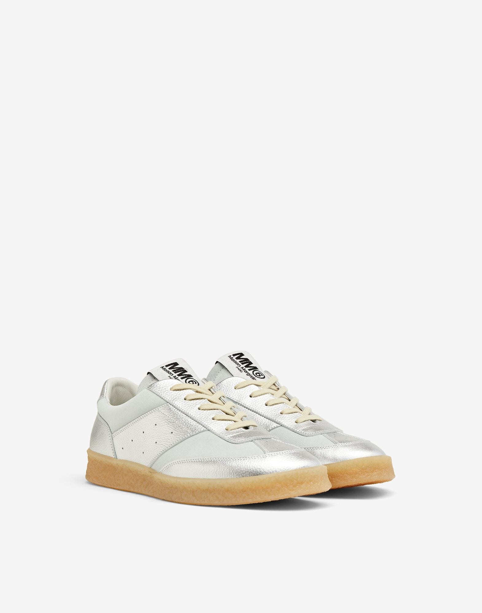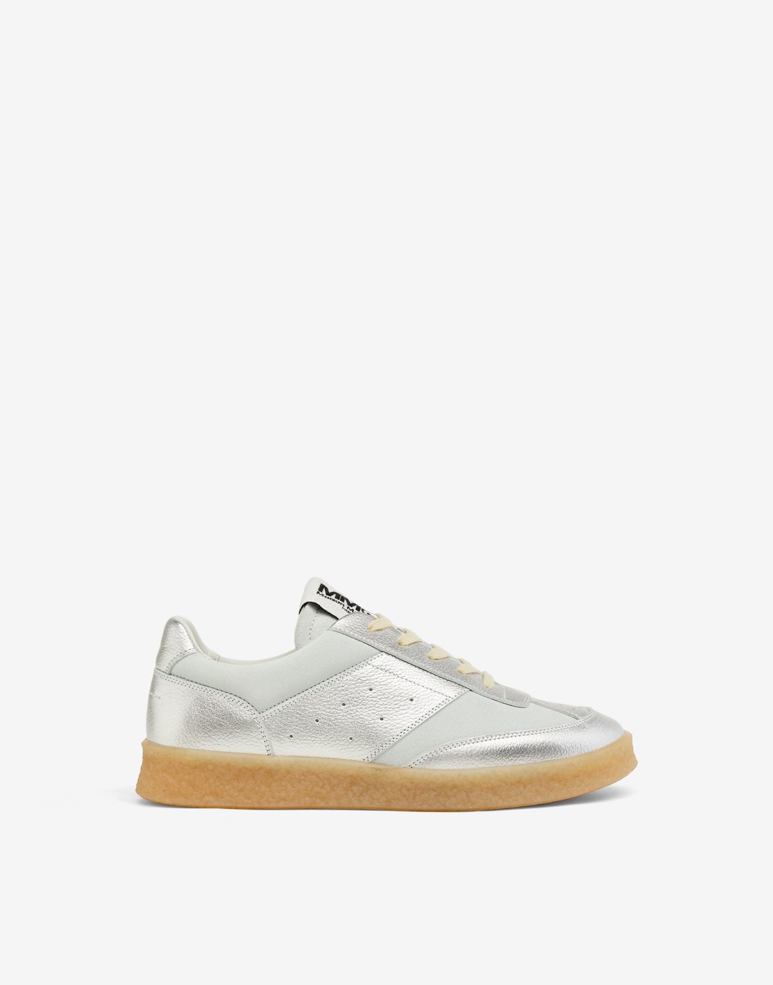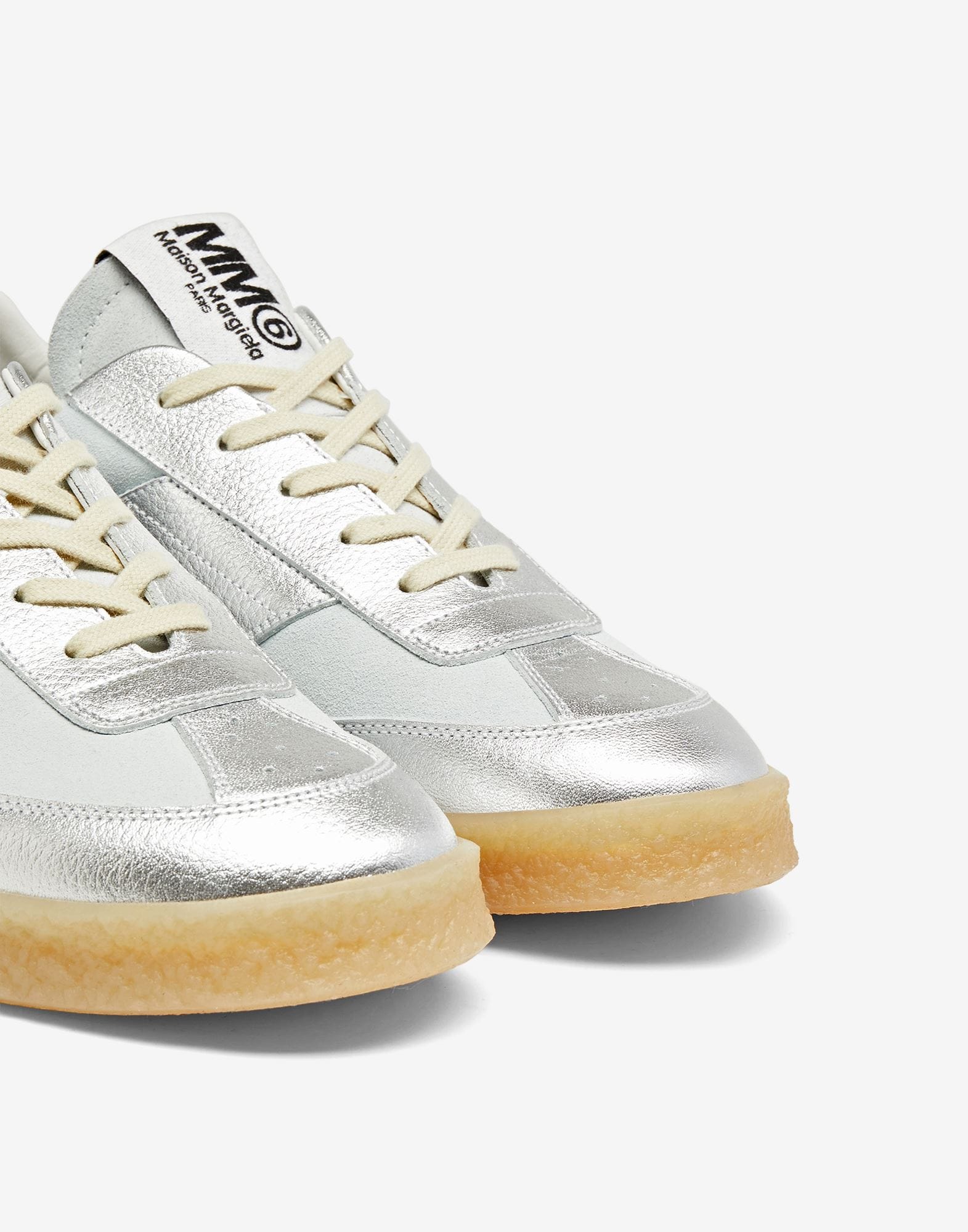 Tennis inspirées d’un modèle vintage, confectionnées en cuir de veau à effet lamé et en daim, complétées d’une languette à logo et d’une semelle en caoutchouc. Ce modèle reprend à l’arrière la surpiqûre emblématique MM6 de la Maison.