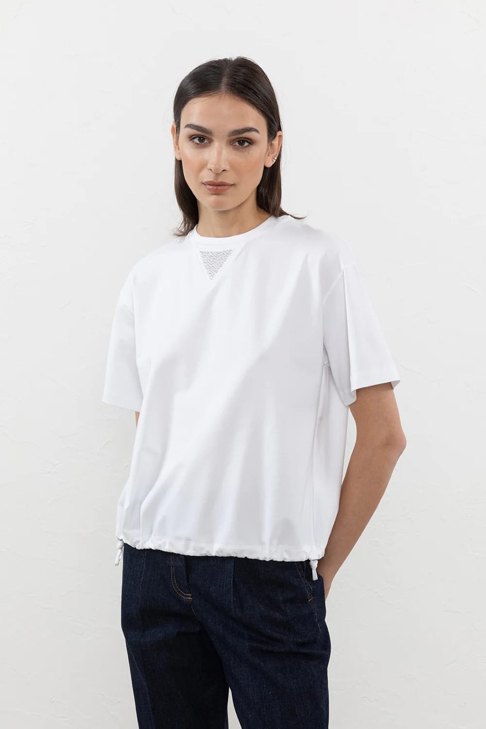 Le col rond donne une note classique, tandis que le triangle en tricot Punto Luce confère de la distinction.