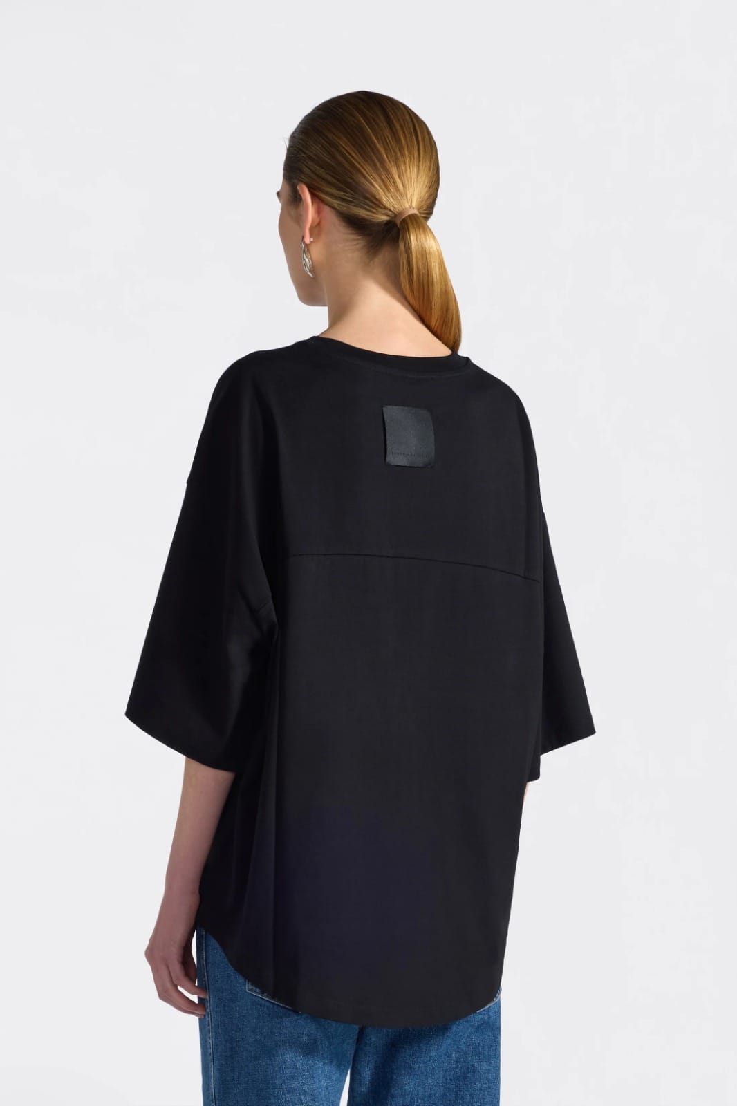 T-SHIRT 100 % COTON À MANCHES COURTES, ENCOLURE RONDE. PATCH EN TISSU NOIR BRILLANT AVEC LOGO AU DOS. COUPE DÉTENDUE, BAS LÉGÈREMENT ASYMÉTRIQUE ET PLUS LONG À L’ARRIÈRE.