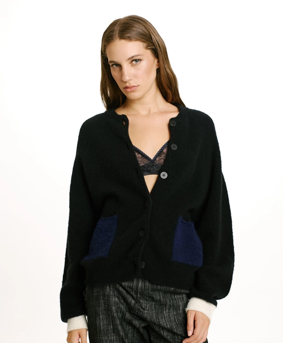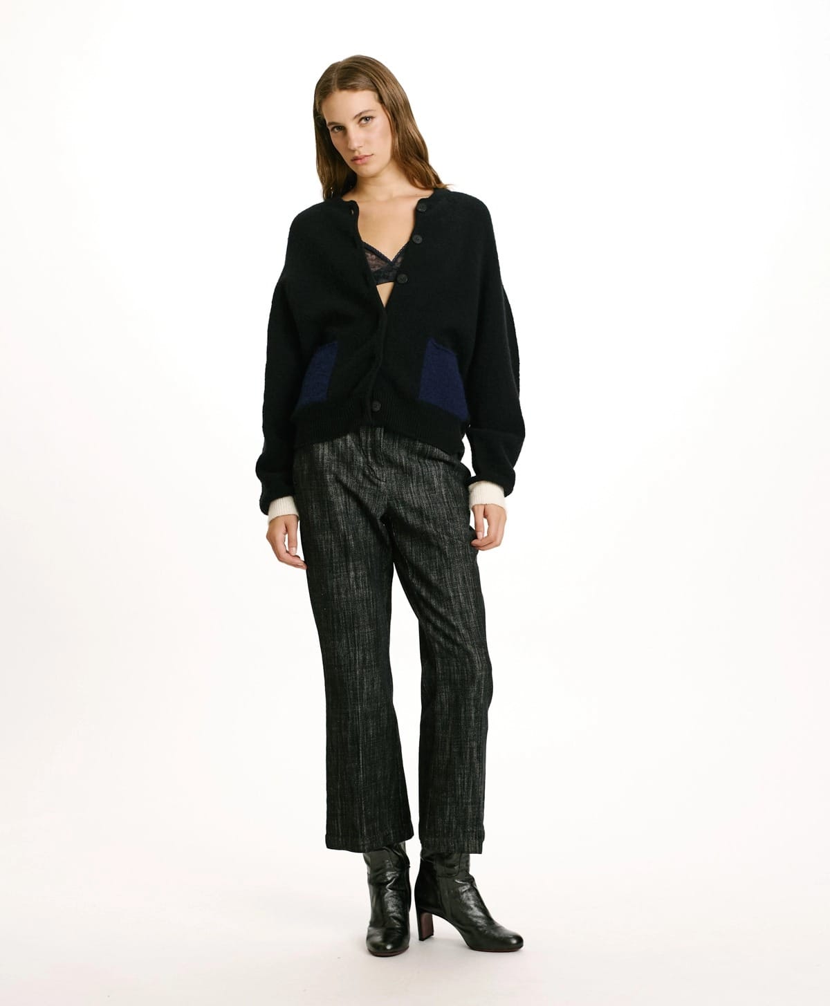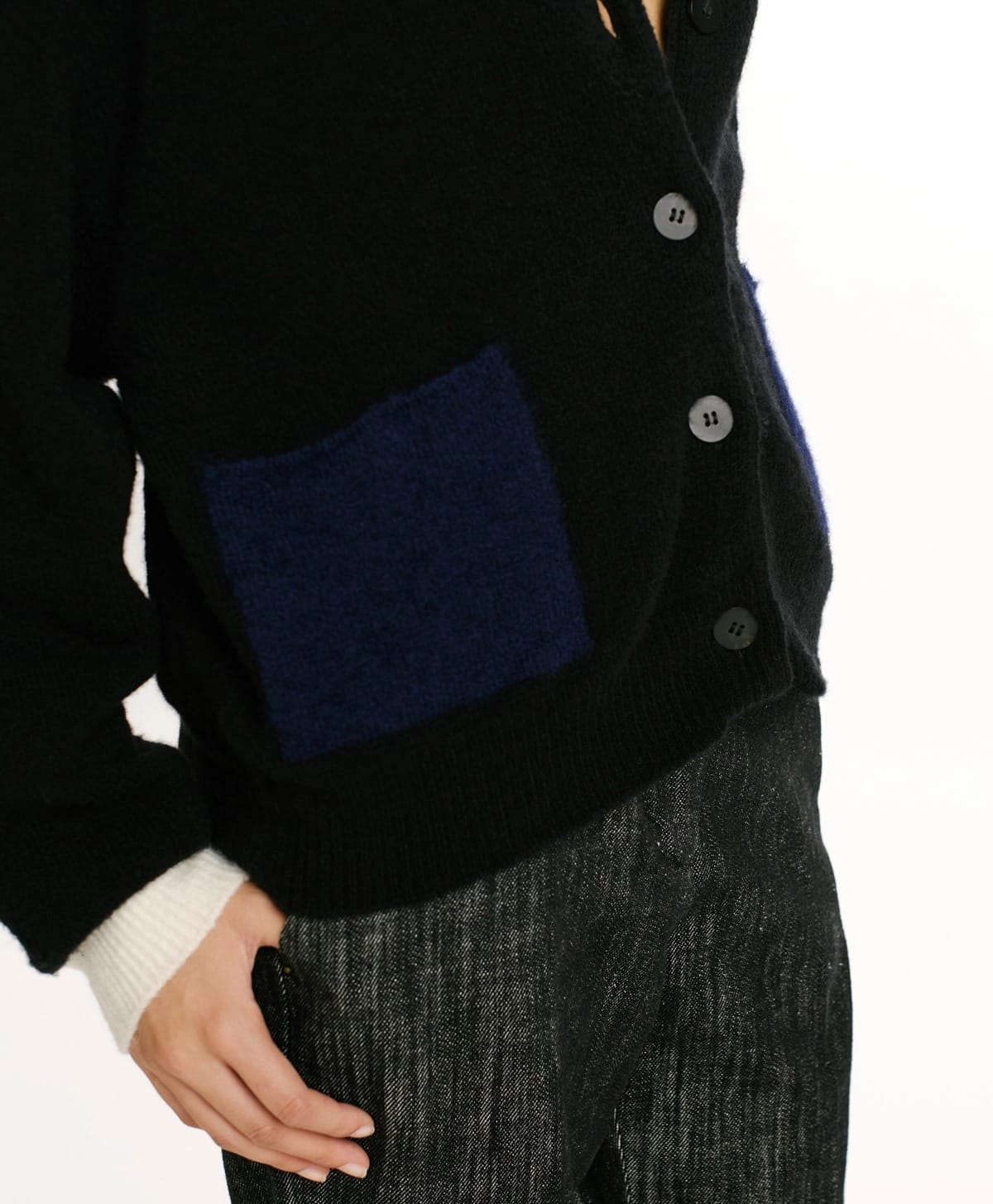 Cardigan en fil de laine stretch effet jersey. Jeu particulier de couleurs contrastées, formant des blocs sur le col, les bas et les côtés. Finition à côtes hautes.